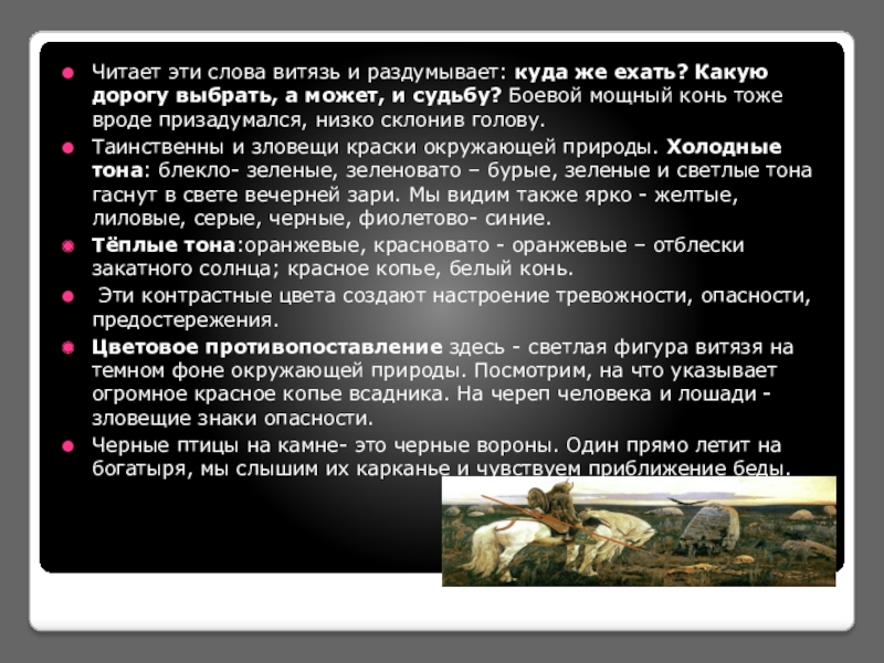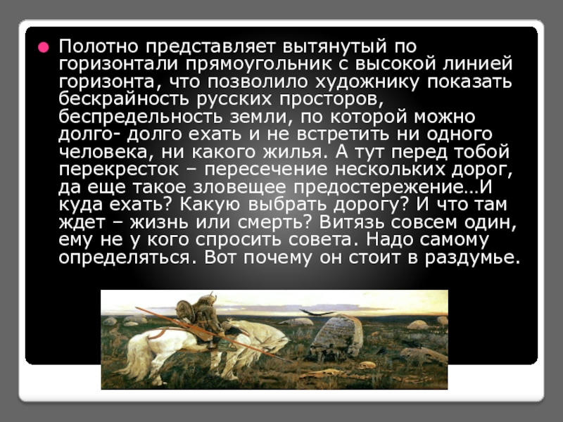 позволило художнику показать бескрайность русских просторов, беспредельность земли, по которой можно долго- долго ехать и не встретить ни одного человека, ни какого жилья. А тут перед тобой перекресток – пересечение нескольких дорог, да еще такое зловещее предостережение…И куда ехать? Какую выбрать дорогу? И что там ждет – жизнь или смерть? Витязь совсем один, ему не у кого спросить совета. Надо самому определяться. Вот почему он стоит в раздумье.