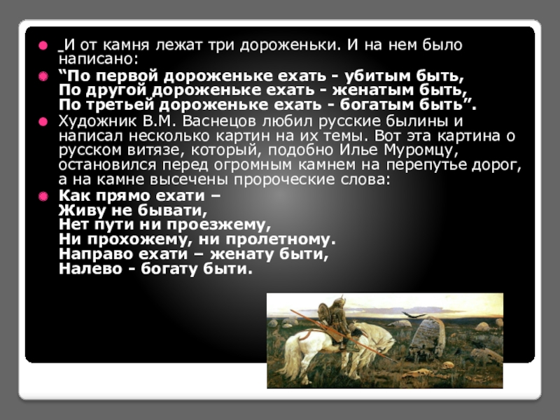 Художник В.М. Васнецов любил русские былины и написал несколько картин на их темы. Вот эта картина о русском витязе, который, подобно Илье Муромцу, остановился перед огромным камнем на перепутье дорог, а на камне высечены пророческие слова: