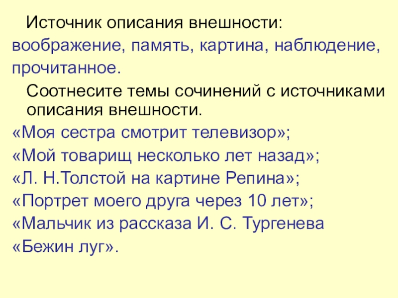 Источник описания внешности:воображение, память, картина, наблюдение,прочитанное.  Соотнесите темы сочинений с источниками описания внешности.«Моя сестра