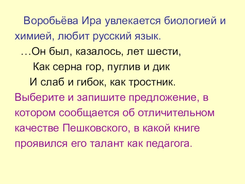 Воробьёва Ира увлекается биологией ихимией, любит русский язык. …Он был, казалось, лет шести,