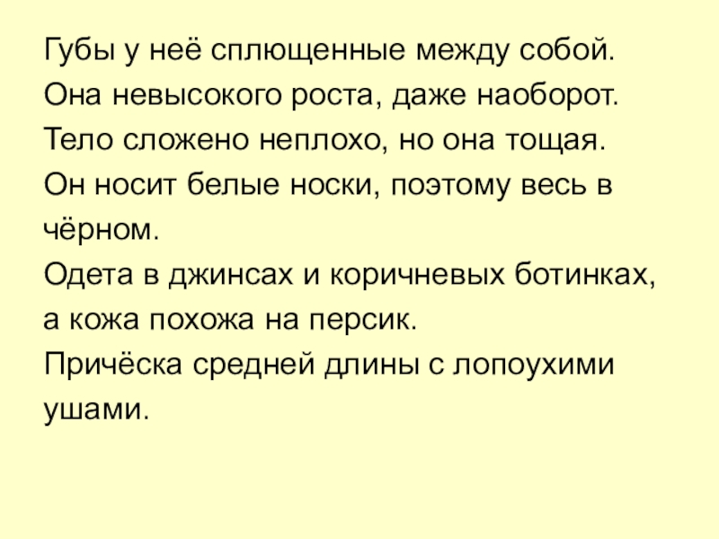 Губы у неё сплющенные между собой.Она невысокого роста, даже наоборот.Тело сложено неплохо, но она тощая.Он носит белые