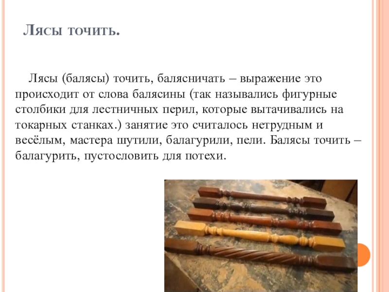 это происходит от слова балясины (так назывались фигурные столбики для лестничных перил, которые вытачивались на токарных станках.) занятие это считалось нетрудным и весёлым, мастера шутили, балагурили, пели. Балясы точить – балагурить, пустословить для потехи.