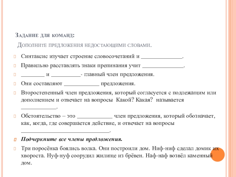Три поросёнка боялись волка. Они построили дом. Ниф-ниф сделал домик их хвороста. Нуф-нуф соорудил жилище из брёвен. Наф-наф возвёл каменный дом.