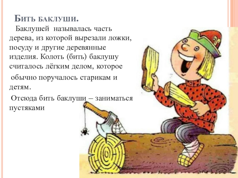 ложки, посуду и другие деревянные изделия. Колоть (бить) баклушу считалось лёгким делом, которое