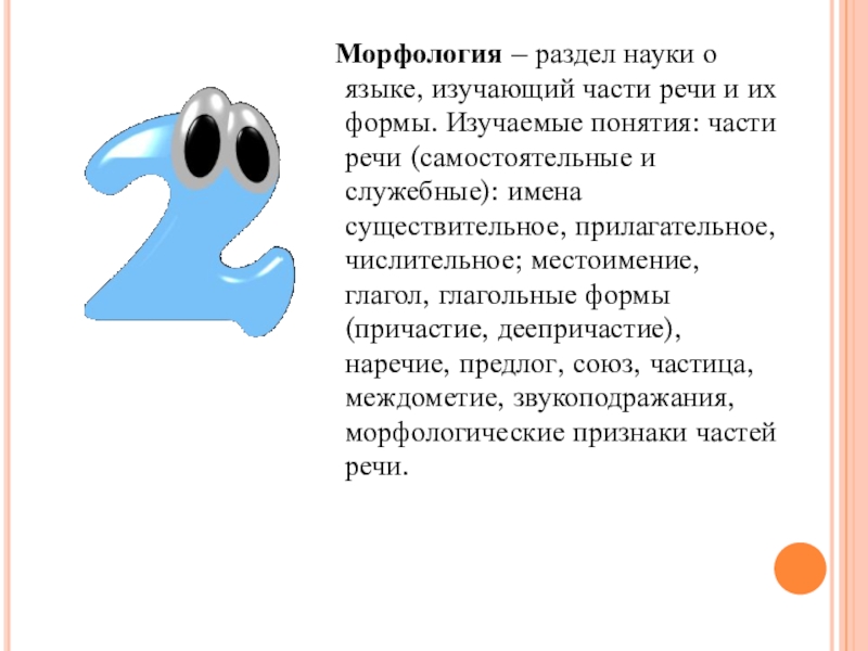 Слайд 5 Морфология – раздел науки о языке, изучающий части речи и их