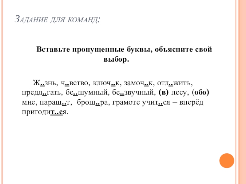 Ж..знь, ч..вство, ключ..к, замоч..к, отл..жить, предл..гать, бе..шумный, бе..звучный, (в) лесу, (обо) мне, параш..т, брош..ра, грамоте учит..ся – вперёд пригодит..ся.