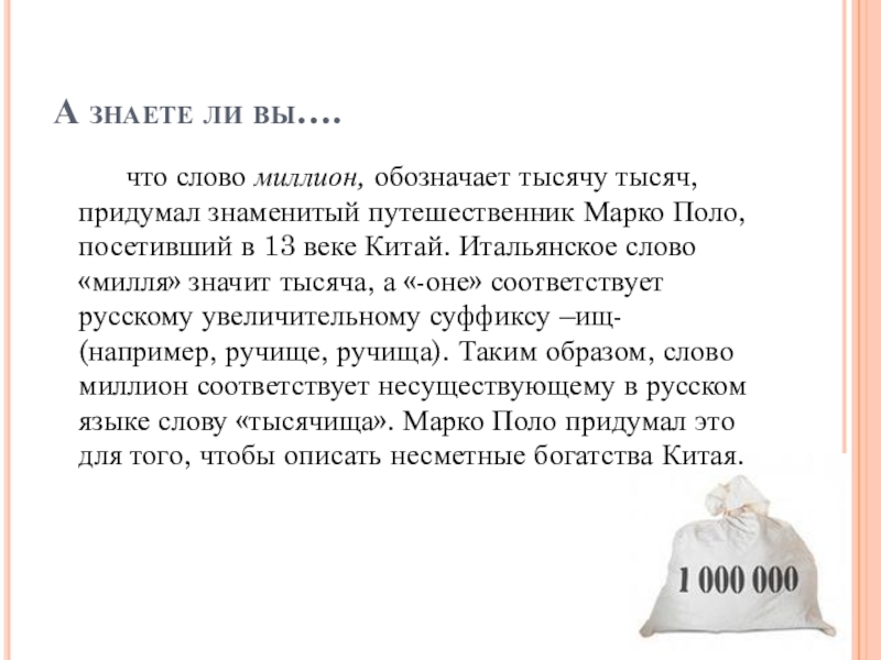 обозначает тысячу тысяч, придумал знаменитый путешественник Марко Поло, посетивший в 13 веке Китай. Итальянское слово «милля» значит тысяча, а «-оне» соответствует русскому увеличительному суффиксу –ищ- (например, ручище, ручища). Таким образом, слово миллион соответствует несуществующему в русском языке слову «тысячища». Марко Поло придумал это для того, чтобы описать несметные богатства Китая.