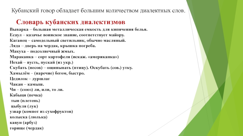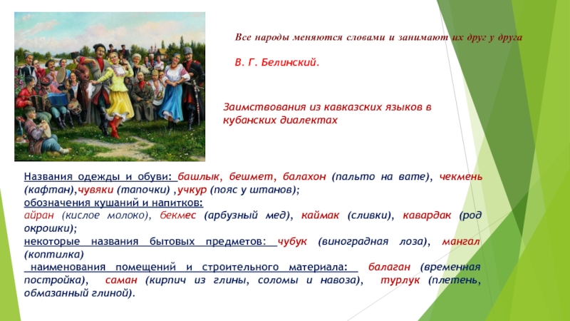 Названия одежды и обуви: башлык, бешмет, балахон (пальто на вате), чекмень (кафтан),чувяки (тапочки) ,учкур (пояс у штанов);