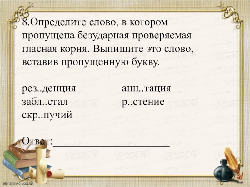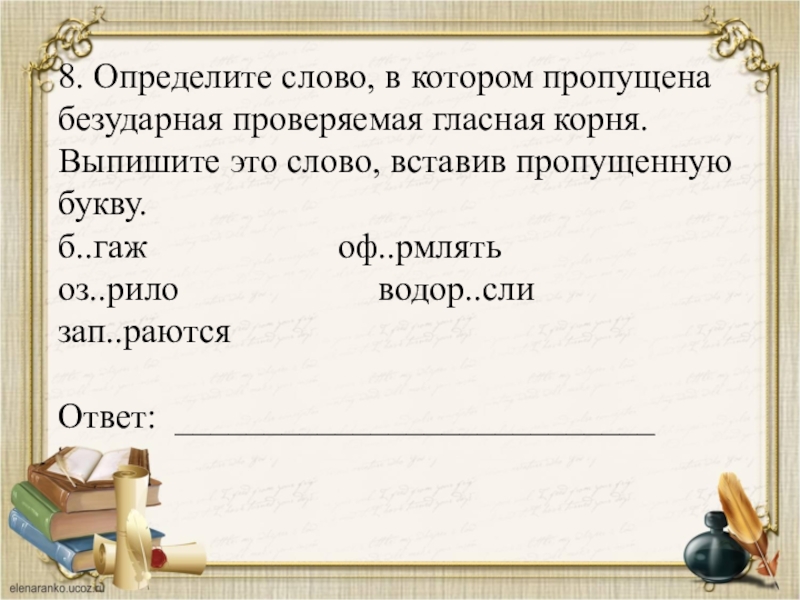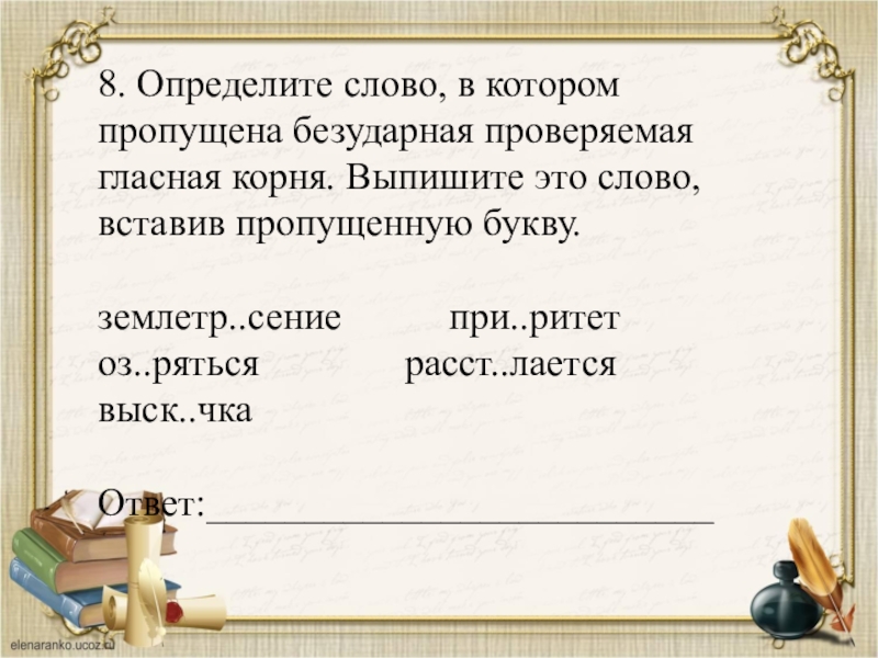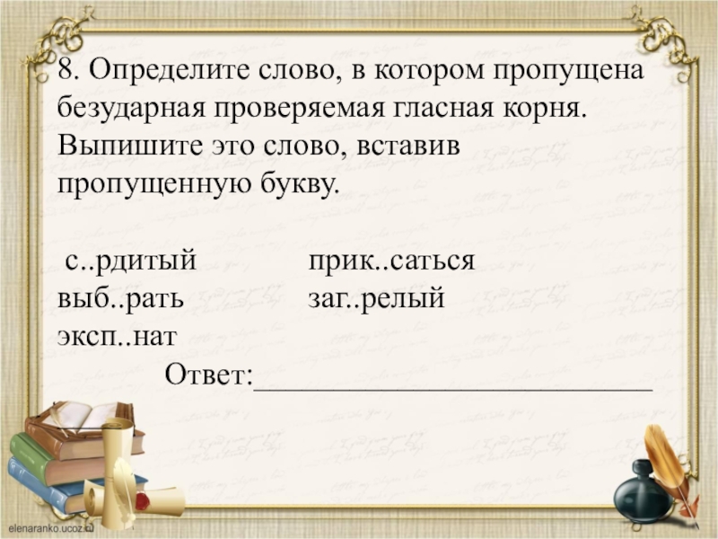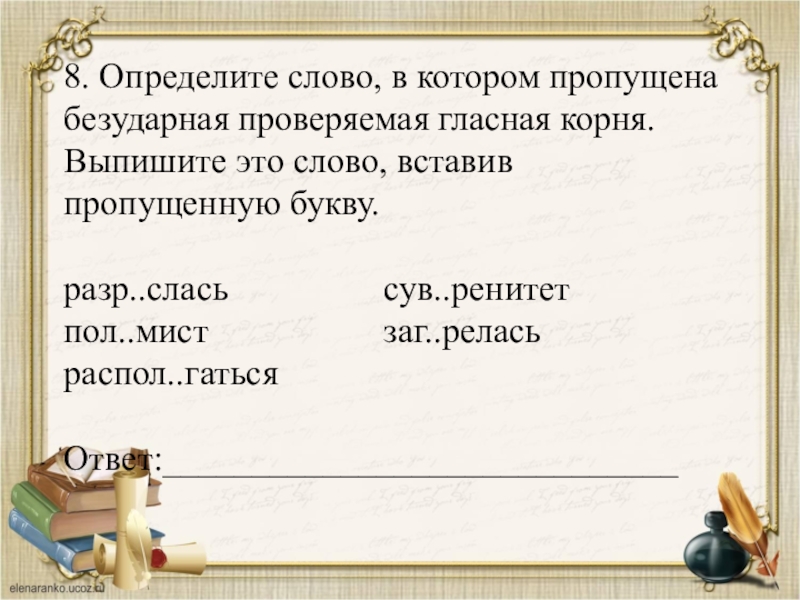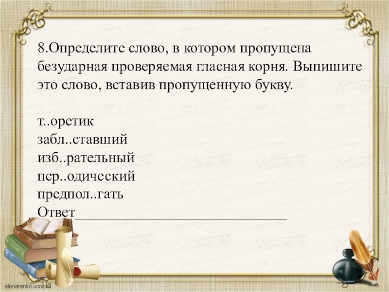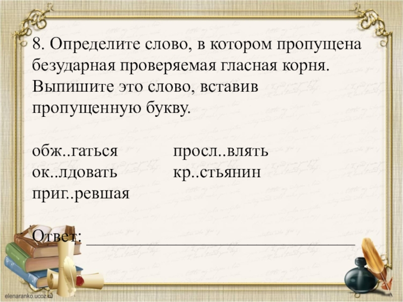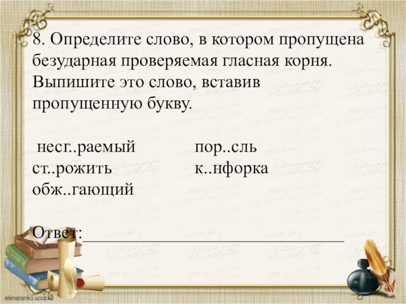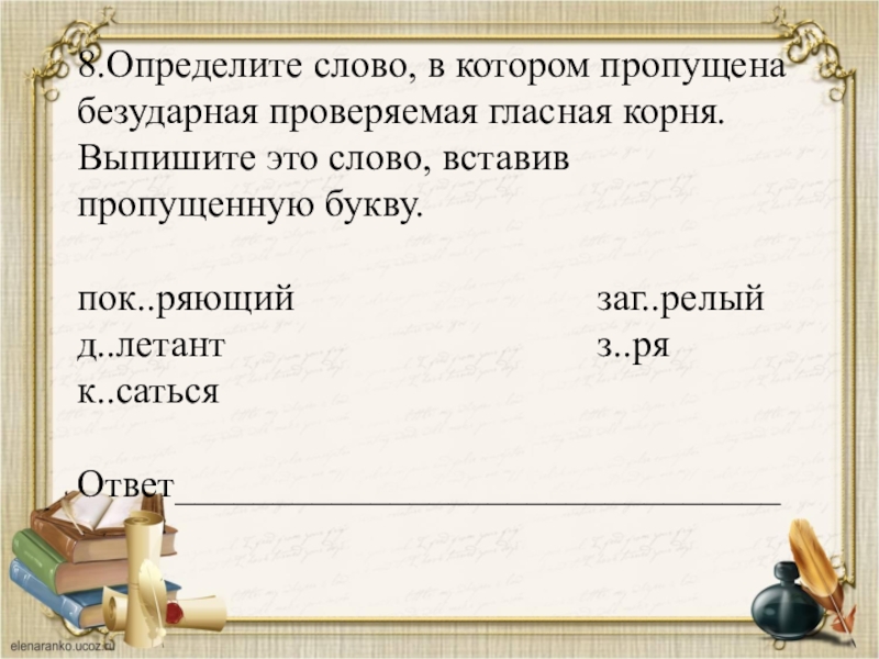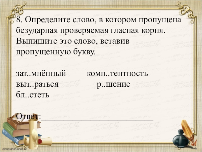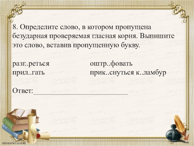 Слайд 198. Определите слово, в котором пропущена безударная проверяемая гласная корня. Выпишите