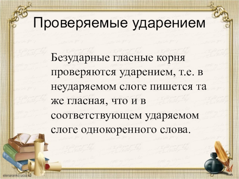 Безударные гласные корня проверяются ударением, т.е. в неударяемом слоге пишется
