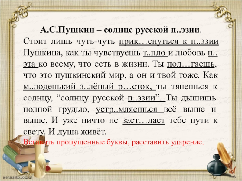 как ты чувствуешь т..пло и любовь п..эта ко всему, что есть в жизни. Ты пол…гаешь, что это пушкинский мир, а он и твой тоже. Как м..лоденький з..лёный р…сток, ты тянешься к солнцу, “солнцу русской п..эзии”. Ты дышишь полной грудью, устр..мляешься всё выше и выше. И уже ничто не заст…лает тебе пути к свету. И душа живёт.