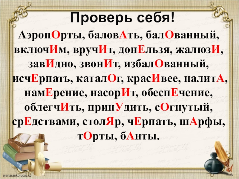 исчЕрпать, каталОг, красИвее, налитА, намЕрение, насорИт, обеспЕчение, облегчИть, принУдить, сОгнутый, срЕдствами, столЯр, чЕрпать, шАрфы, тОрты, бАнты.