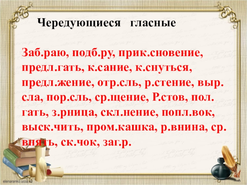 Заб.раю, подб.ру, прик.сновение, предл.гать, к.сание,