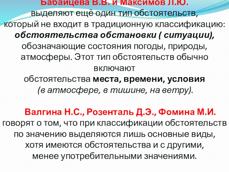 не входит в традиционную классификацию: обстоятельства обстановки ( ситуации), обозначающие состояния погоды, природы, атмосферы. Этот тип обстоятельств обычно включают