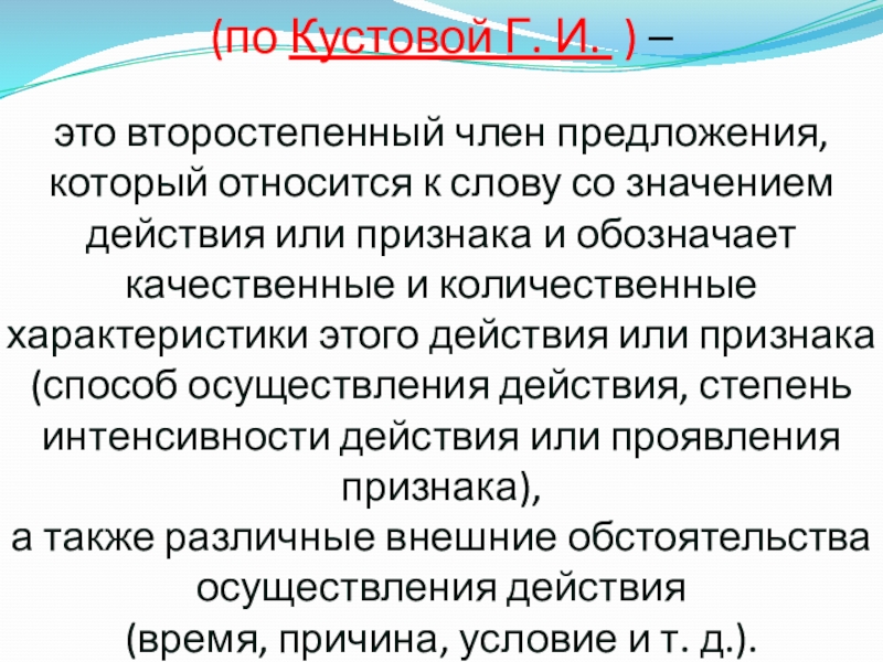 который относится к слову со значением действия или признака и обозначает качественные и количественные характеристики этого действия или признака (способ осуществления действия, степень интенсивности действия или проявления признака),