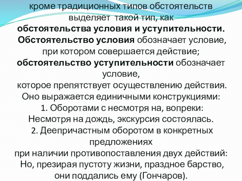 Обстоятельства уступки: обозначает условие, вопреки которому происходит действие, и отвечает на вопросы