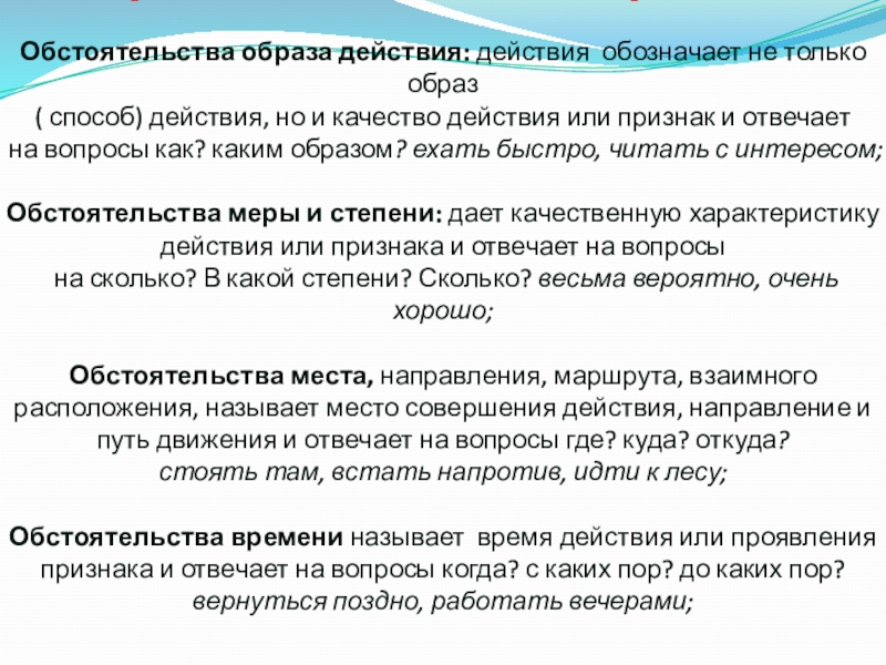 Обстоятельства меры и степени: дает качественную характеристику действия или признака и отвечает на вопросы
