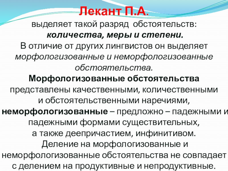 отличие от других лингвистов он выделяет морфологизованные и неморфологизованные обстоятельства.