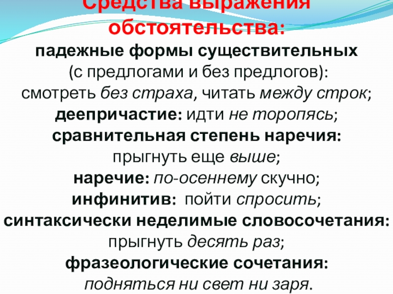 и обстоятельственными наречиями, неморфологизованные – предложно – падежными и падежными формами существительных,