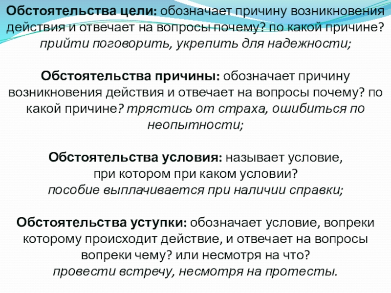 Слайд 6Обстоятельства цели: обозначает причину возникновения действия и отвечает на вопросы почему?