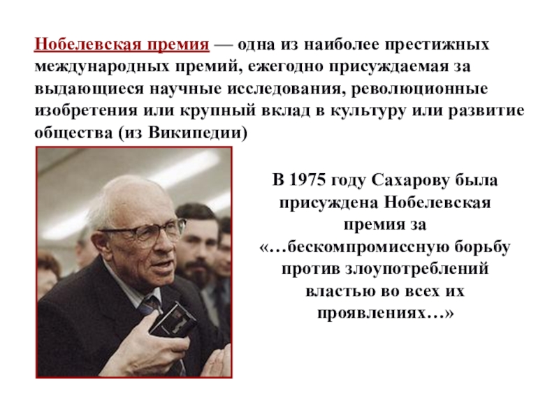 В 1975 году Сахарову была присуждена Нобелевская премия за «…бескомпромиссную борьбу против злоупотреблений властью во всех их проявлениях…»