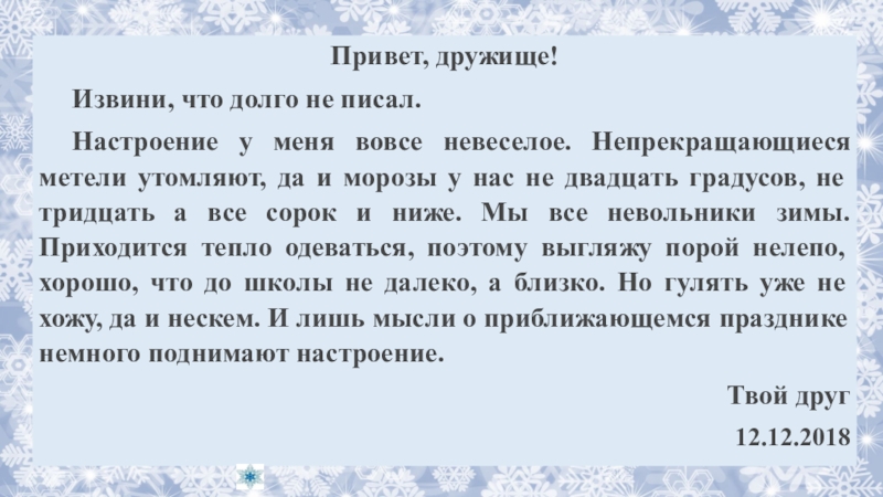 Непрекращающиеся метели утомляют, да и морозы у нас не двадцать градусов, не тридцать а все сорок и ниже. Мы все невольники зимы. Приходится тепло одеваться, поэтому выгляжу порой нелепо, хорошо, что до школы не далеко, а близко. Но гулять уже не хожу, да и нескем. И лишь мысли о приближающемся празднике немного поднимают настроение.