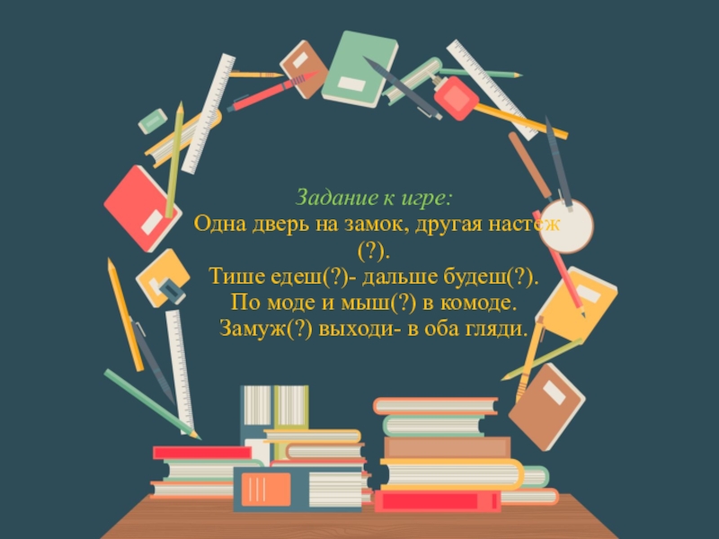 Слайд 5Задание к игре:  Одна дверь на замок, другая настеж(?). Тише едеш(?)- дальше