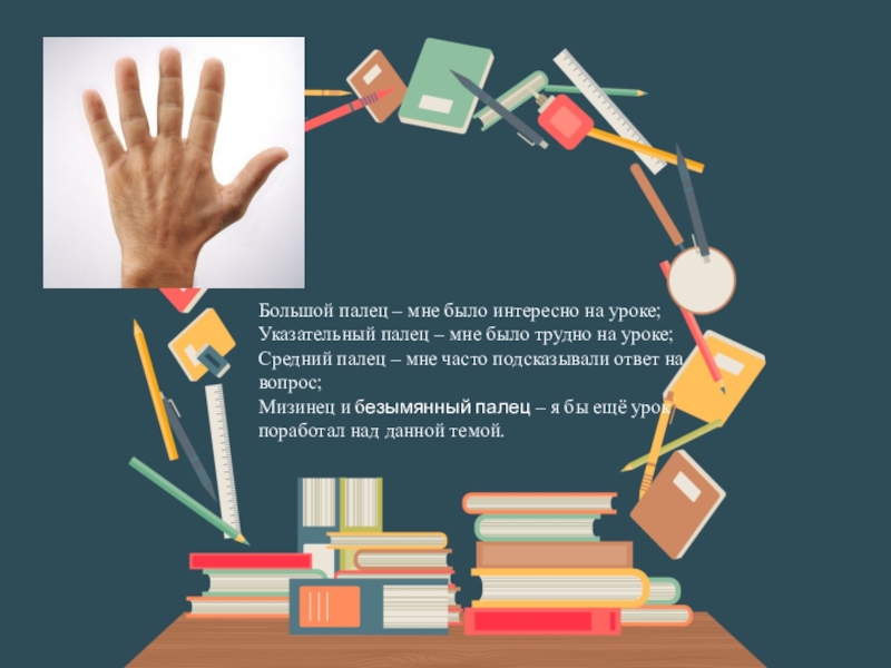 Большой палец – мне было интересно на уроке;Указательный палец – мне было трудно на уроке;Средний палец
