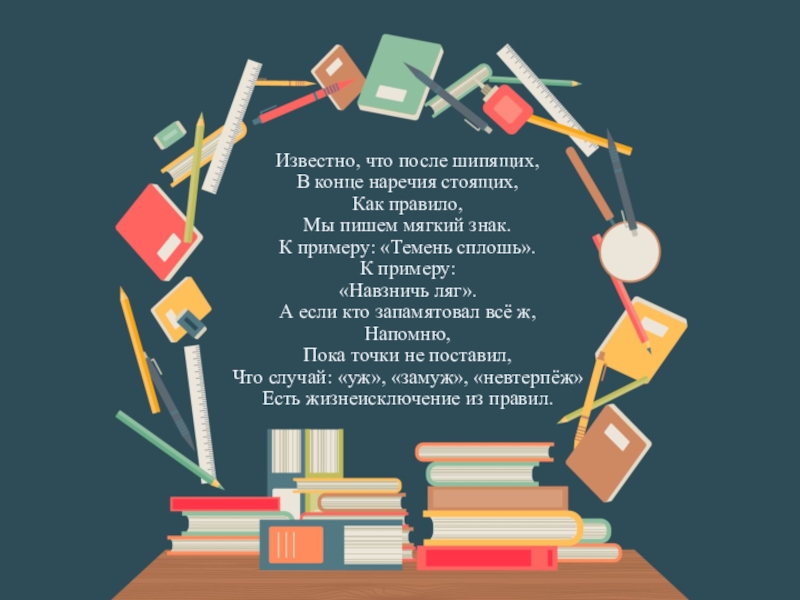 Слайд 4Известно, что после шипящих, В конце наречия стоящих, Как правило, Мы пишем мягкий знак. К