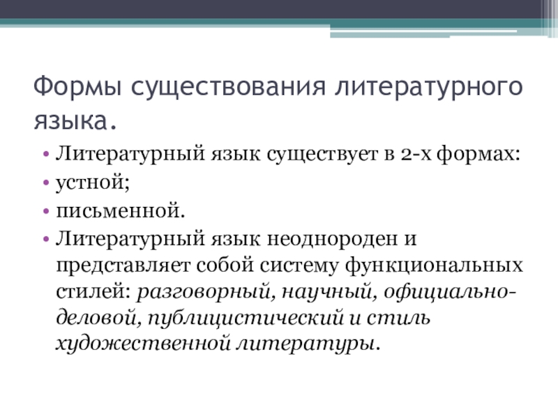 язык неоднороден и представляет собой систему функциональных стилей: разговорный, научный, официально-деловой, публицистический и стиль художественной литературы.