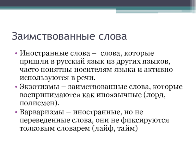 Экзотизмы – заимствованные слова, которые воспринимаются как иноязычные (лорд, полисмен).