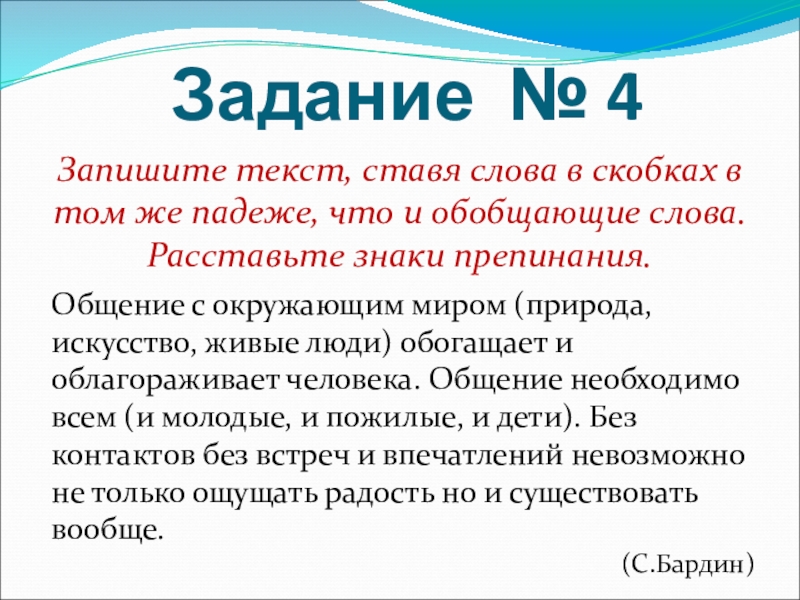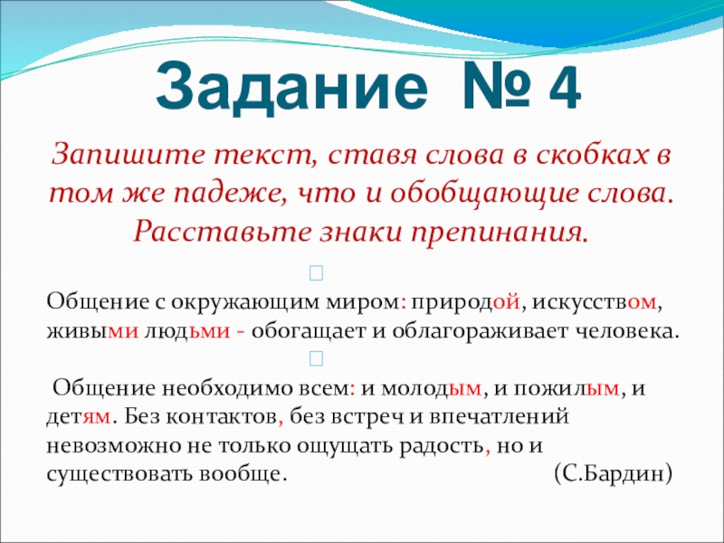 Задание № 4Запишите текст, ставя слова в скобках в том же падеже, что и обобщающие слова. Расставьте