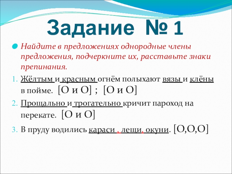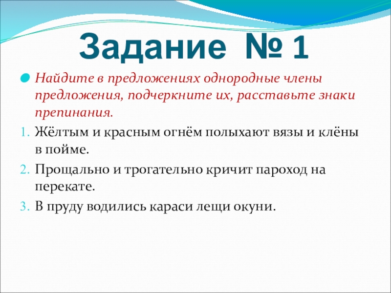 Задание № 1Найдите в предложениях однородные члены предложения, подчеркните их, расставьте знаки препинания.Жёлтым и красным огнём полыхают