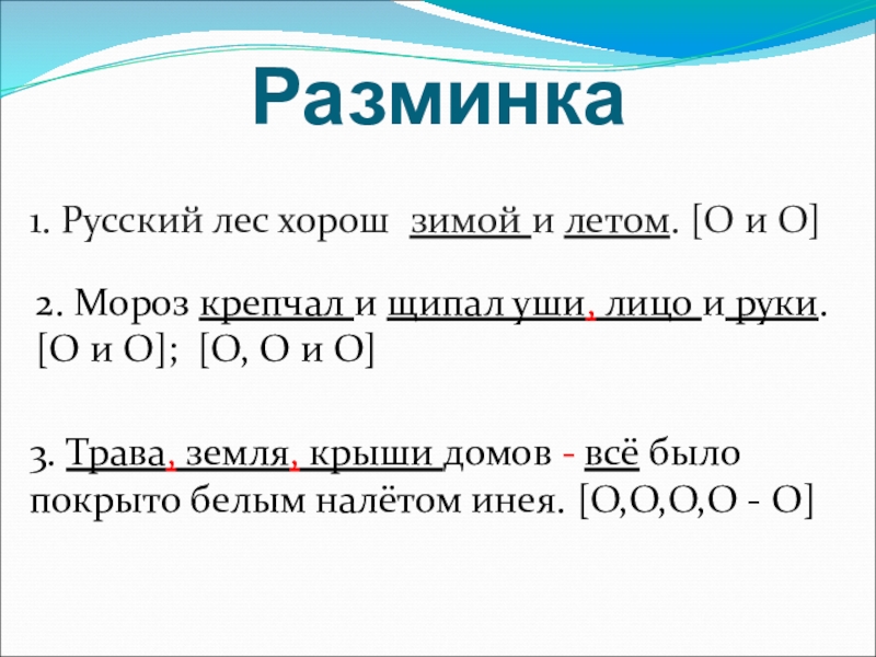 Разминка 1. Русский лес хорош зимой и летом. [O и O]2. Мороз крепчал и щипал уши, лицо