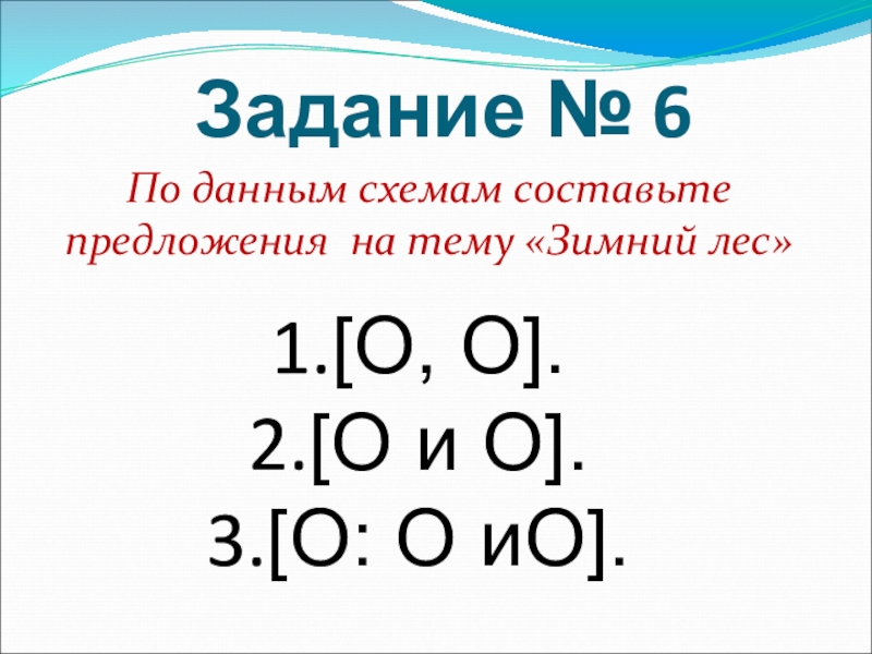 Задание № 6По данным схемам составьте предложения на тему «Зимний лес»[O, O].[O и O].[O: O иO].