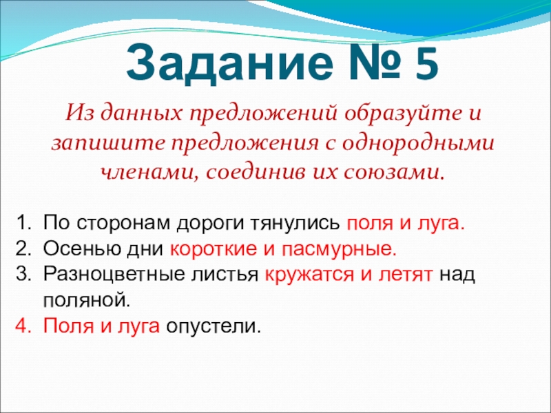 Задание № 5Из данных предложений образуйте и запишите предложения с однородными членами, соединив их союзами.По сторонам дороги