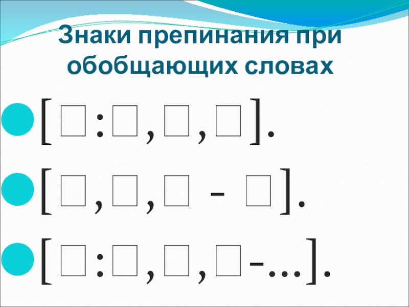 Знаки препинания при обобщающих словах[?:?,?,?].[?,?,? - ?].[?:?,?,?-...].