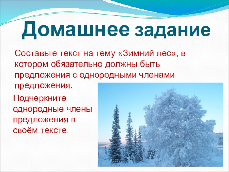 Домашнее заданиеСоставьте текст на тему «Зимний лес», в котором обязательно должны быть предложения с однородными членами предложения.