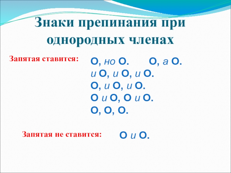Знаки препинания при однородных членахЗапятая не ставится:Запятая ставится:O, но O.    O, а O.и O,