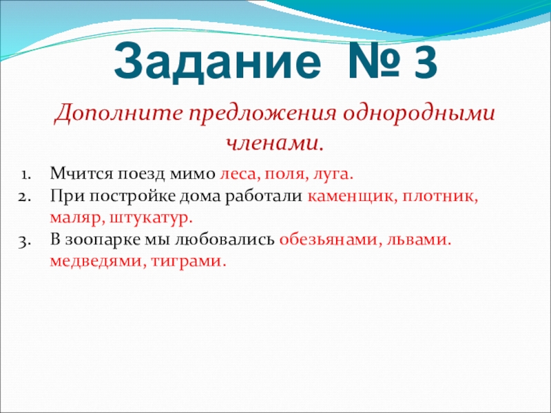 Задание № 3Дополните предложения однородными членами.Мчится поезд мимо леса, поля, луга.При постройке дома работали каменщик, плотник, маляр,