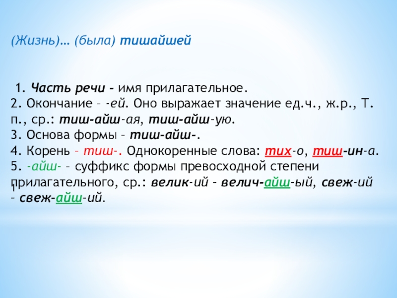 значение ед.ч., ж.р., Т.п., ср.: тиш-айш-ая, тиш-айш-ую.
