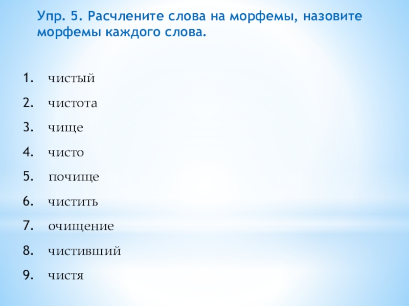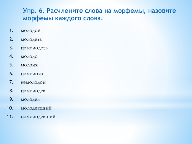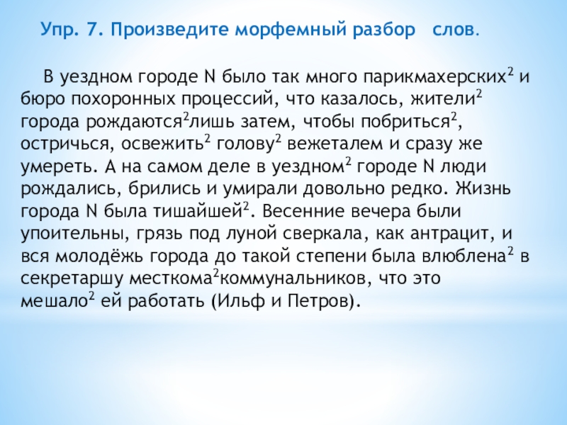 Слайд 44Упр. 7. Произведите морфемный разбор слов.
