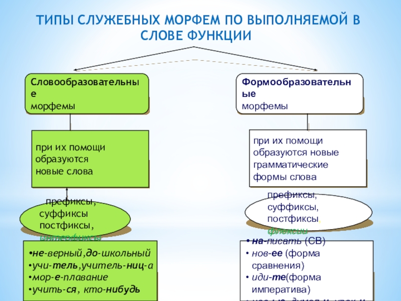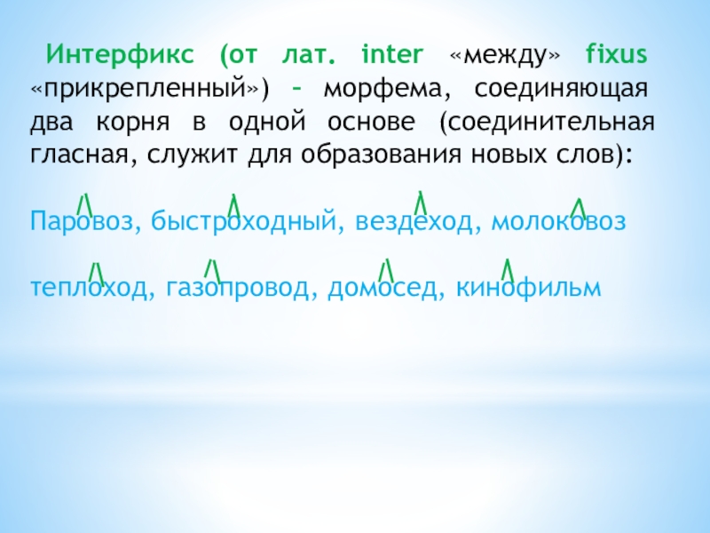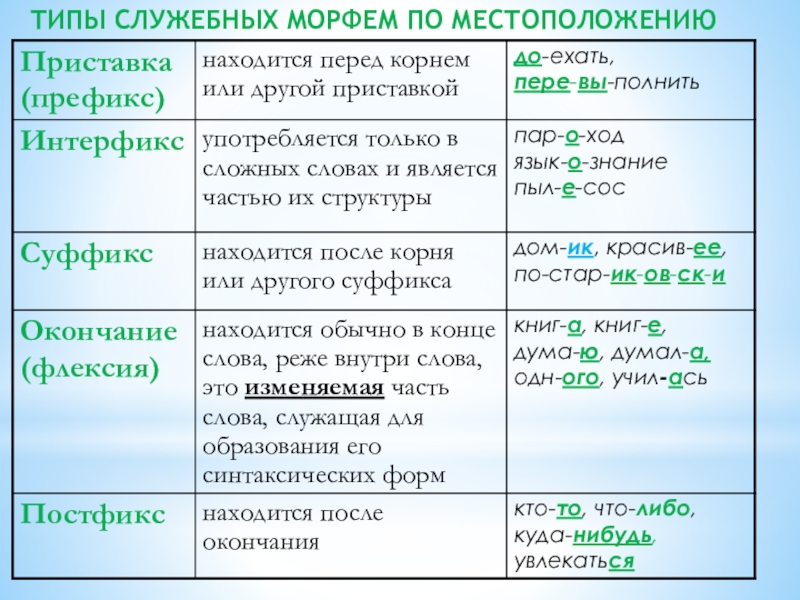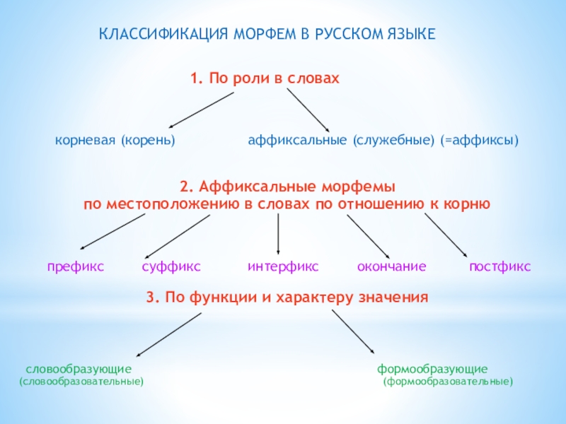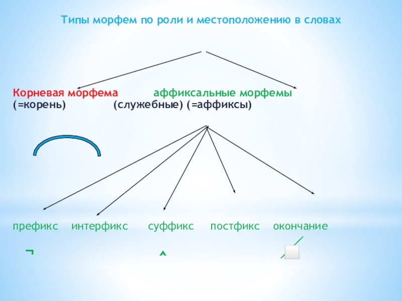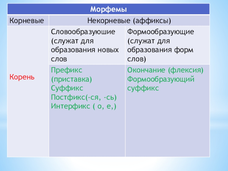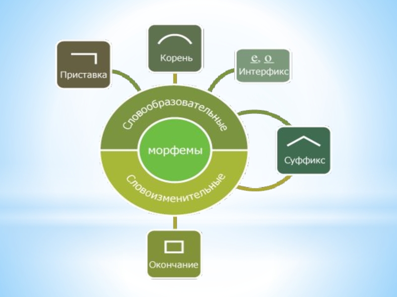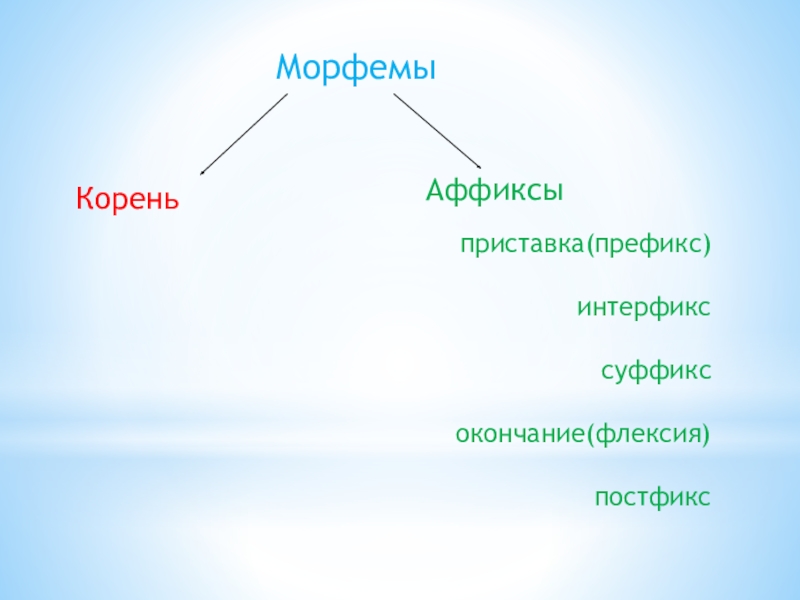 Морфемы – значимые части слова: приставка, корень, интерфикс, суффикс, окончание постфикс.