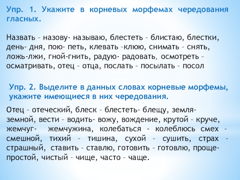Упр. 2. Выделите в данных словах корневые морфемы, укажите имеющиеся в них чередования.