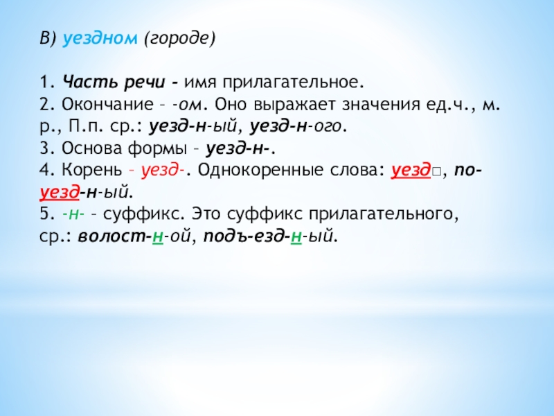 ед.ч., м.р., П.п. ср.: уезд-н-ый, уезд-н-ого.