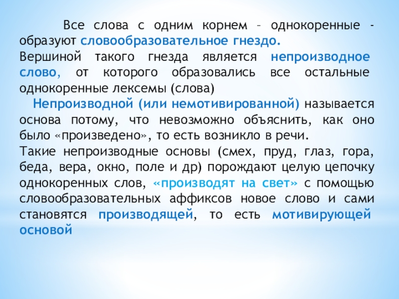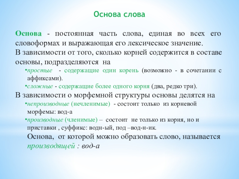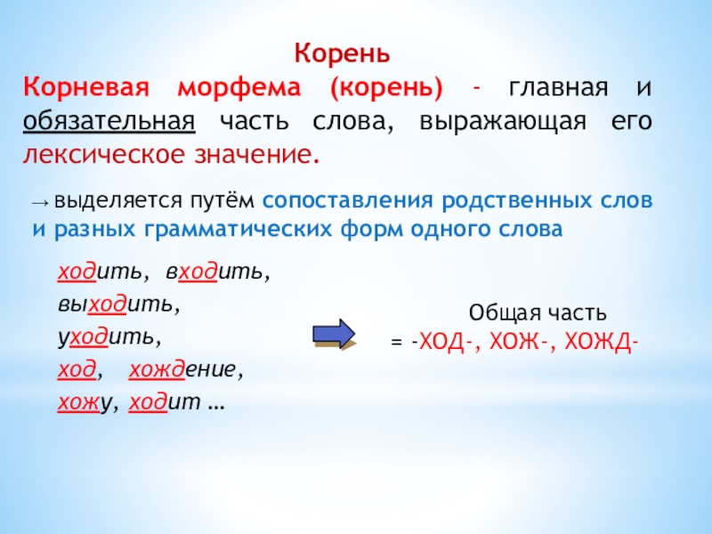 Корневая морфема (корень) - главная и обязательная часть слова, выражающая его