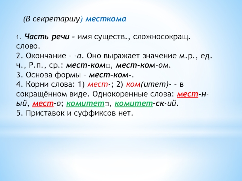 4. Корни слова: 1) мест-; 2) ком(итет)- – в сокращённом виде. Однокоренные слова: мест-н-ый, мест-о; комитет□, комитет-ск-ий.