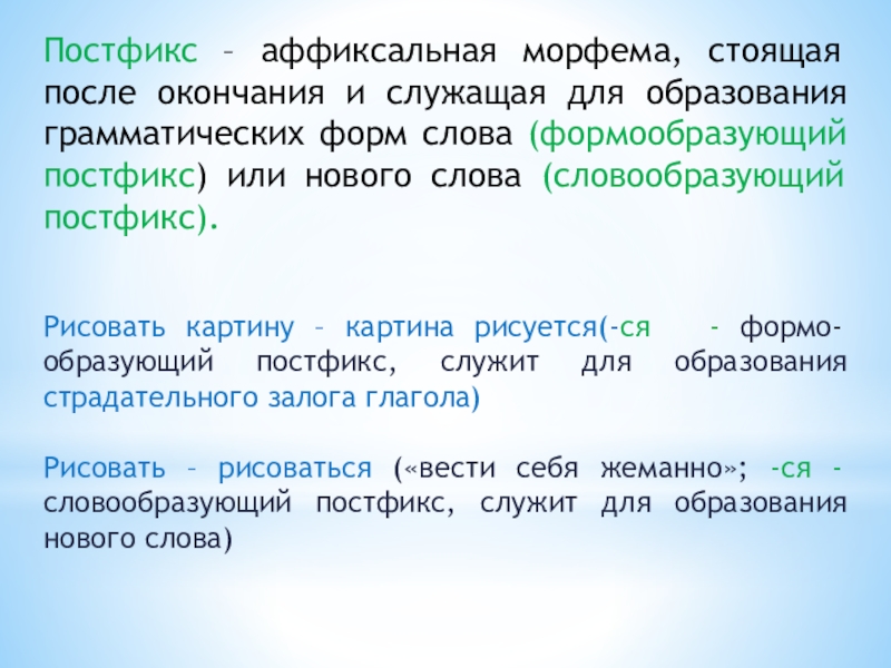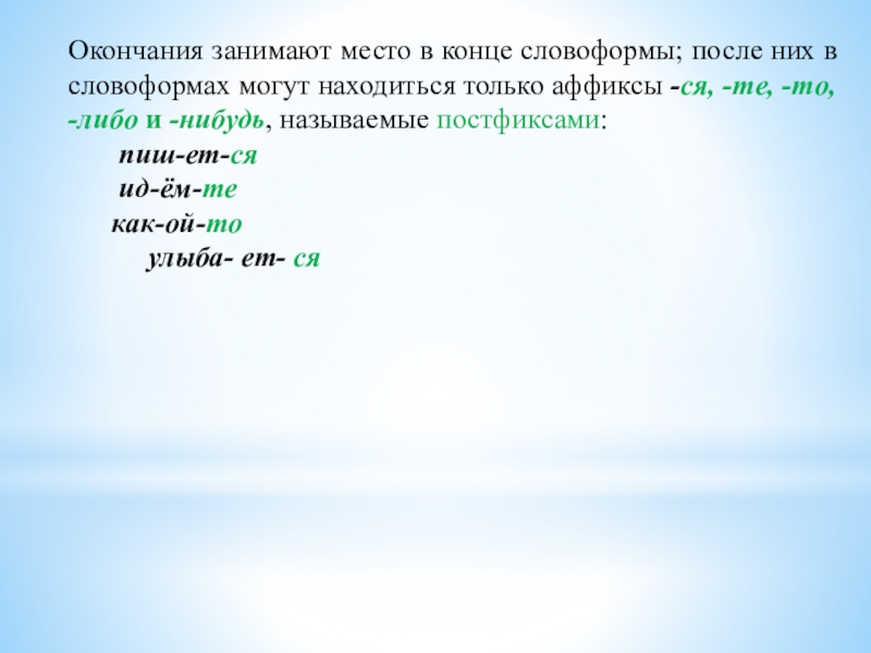6. -ся – постфикс возвратного глагола, ср.: мы-ть-ся, куп-а-ть-ся.