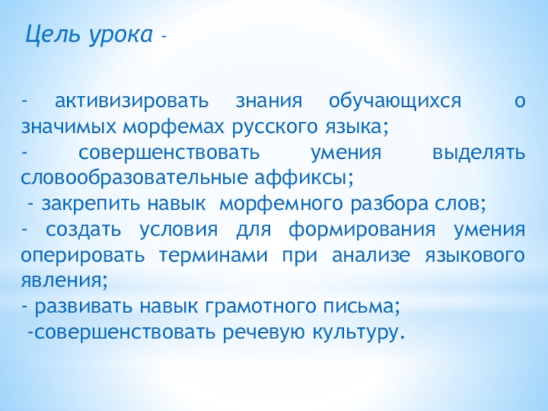 - совершенствовать умения выделять словообразовательные аффиксы;
