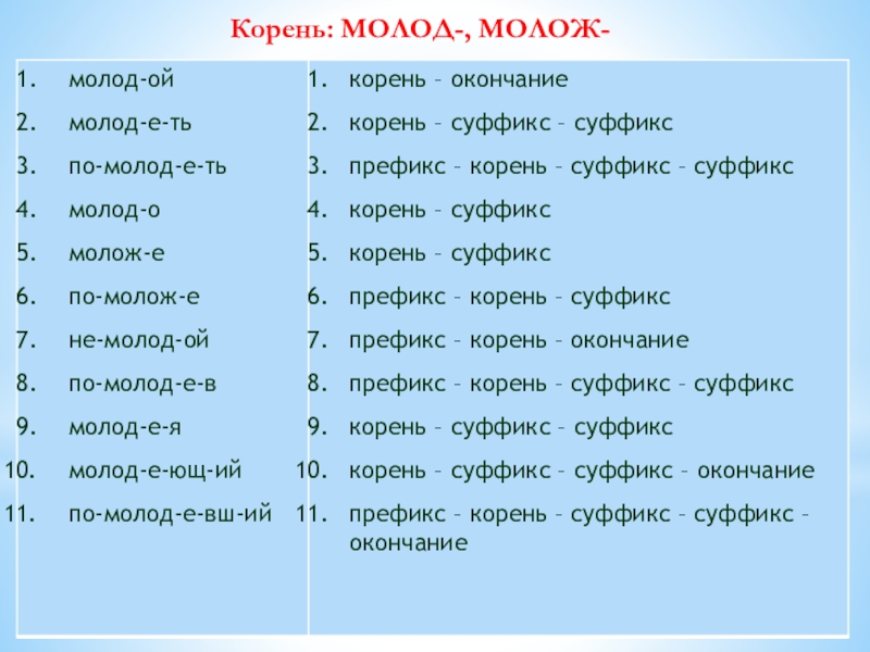 Напр., лес-н-ой, добр-от-а, вы-ход, бра-ть.